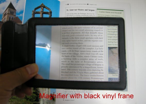 Flat, light and powerful magnifier (Fresnel Lens ) enhances enjoyments of reading with black holding frame. It is easy to insert into the phone index book or magazine, cheap and handy for every field. The product is also a good premium for giveaway or promotion with client’s logo onto it.