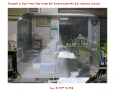 Soft wide-angle lens with static electrical self-attached function for all kind of Vans, 8 x 10 inch. Wide-angle back lens enlarge the back dead angle of Vans and ensures the safety by seeing through the rear mirror inside the vans.